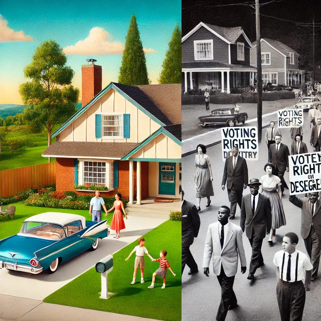 Back then, the American Dream was a term that resonated across the country. Wages were up. The new suburbs were welcoming folks into brand new homes. But, it was also a time of deep inequality and systemic exclusion for millions of Americans. Redlining kept black families out of the burbs. Women were designated “homemakers.” Immigrants were limited by strict quotas. Industries were allowed to contaminate our air, water and soil. And, while kids watched “Leave it To Beaver,” people were getting beaten in the streets for demanding the right to vote or attend desegregated schools.